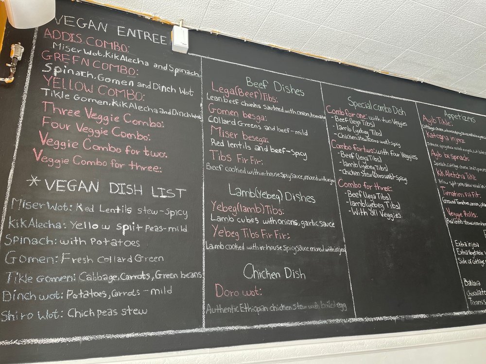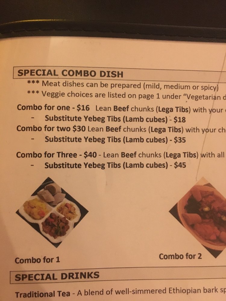 Lean beef chunks (lega tibs) with your choice of 2 veggies. Add Substitution yebeg tibs for an additional cost. Spicy.