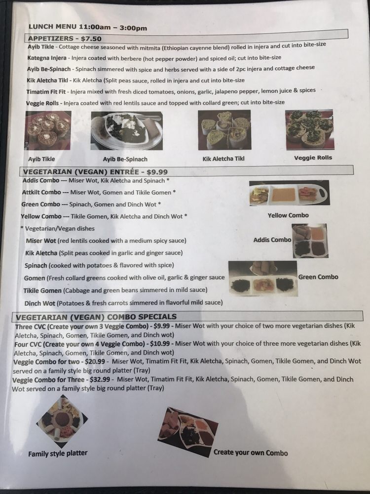 Lean beef chunks (lega tibs) with all veggie dishes. Served with injera - a pancake-like bread made from fermented teff and wheat flour. Spicy.